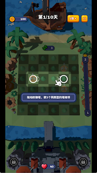 1、進入游戲后,拖動防御塔,使三個相同的塔在一起